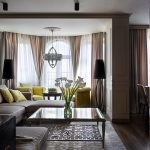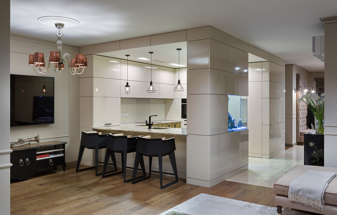Завдячуючи багаторічному знайомству та повному взаєморозумінню із замовником, оздоблення та оформлення цих апартаментів перетворилося у захоплюючий та приємний процес, який не хотілося завершувати. Частина предметів меблів була виготовлена по кресленням дизайнера.